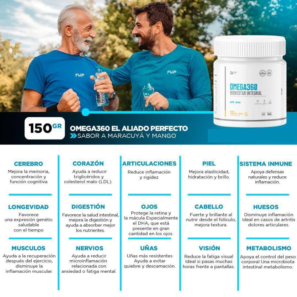 Omega 360° (de FWP) es un suplemento alimenticio nutricional de alta calidad, formulado para apoyar el bienestar integral del cuerpo con énfasis en la salud cardiovascular, cerebral y articular, usando ácidos grasos esenciales Omega‑3 de alta pureza.